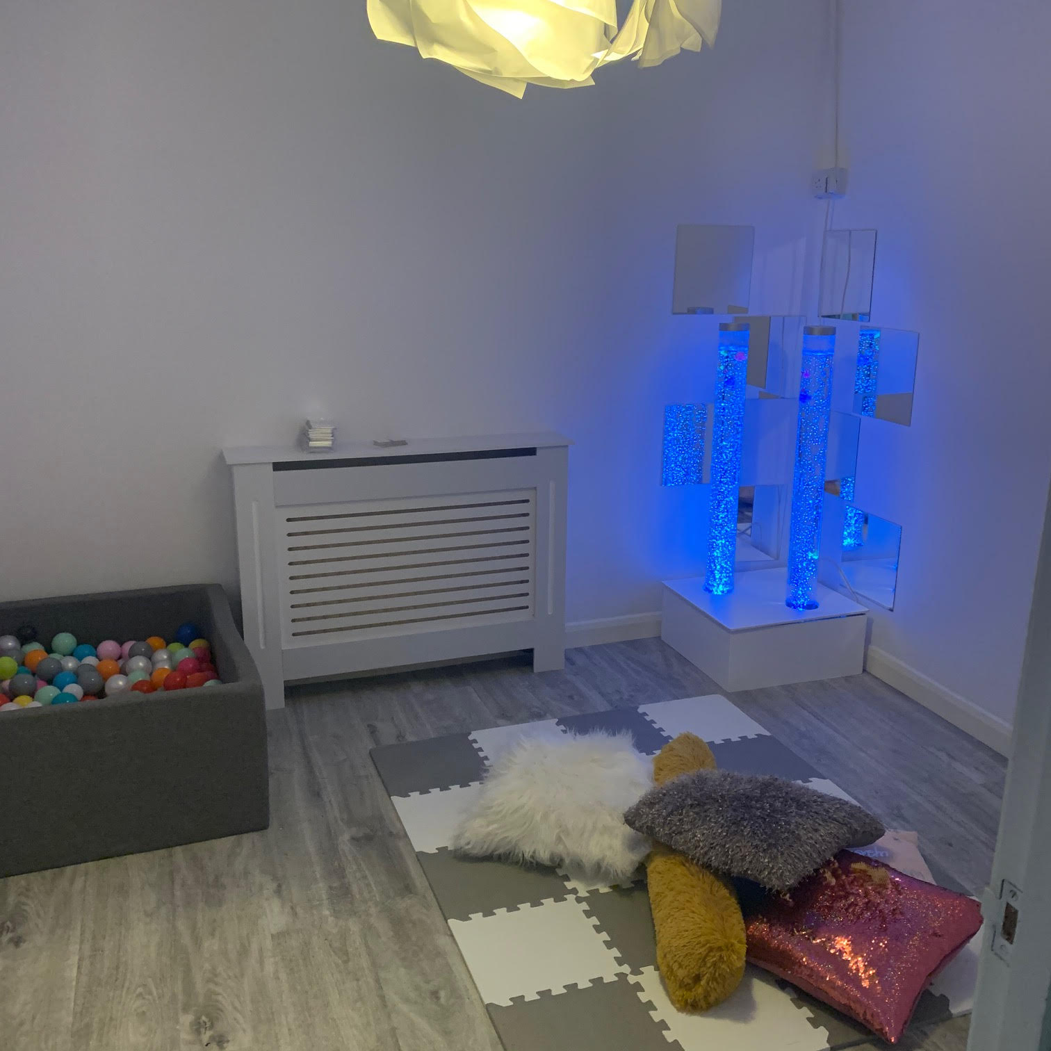 On the side of our playroom we have our sensory room, this has been designed to ignite the senses with a range of multi sensory aids including noises, textures, lights and more.